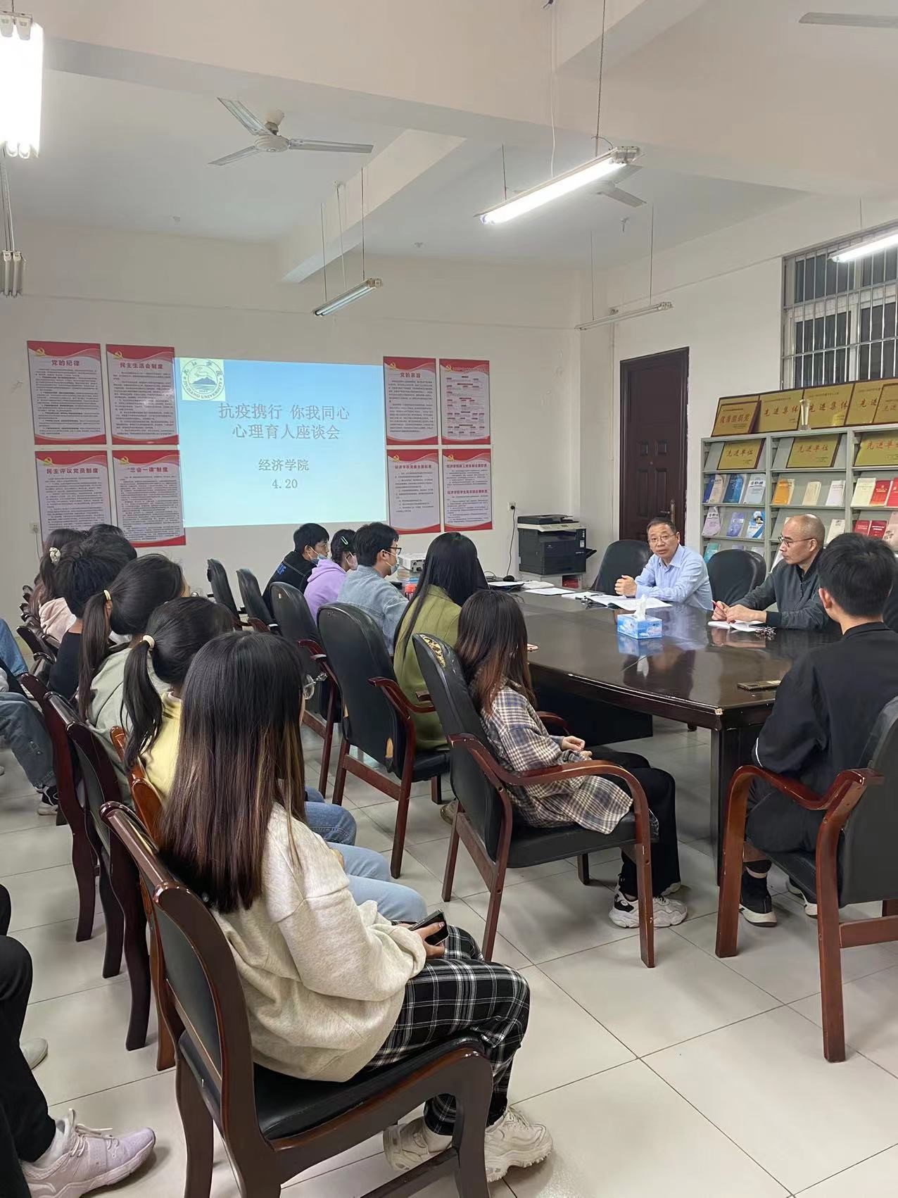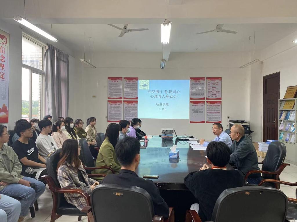4月20日下午jinnianhui金年会诚信至上在义丰楼619开展“抗疫携行 你我同心”心理育人座谈会。学院党委书记漆晗东、副书记谢忠、心理工作负责人丁春、各班心理委员参会。