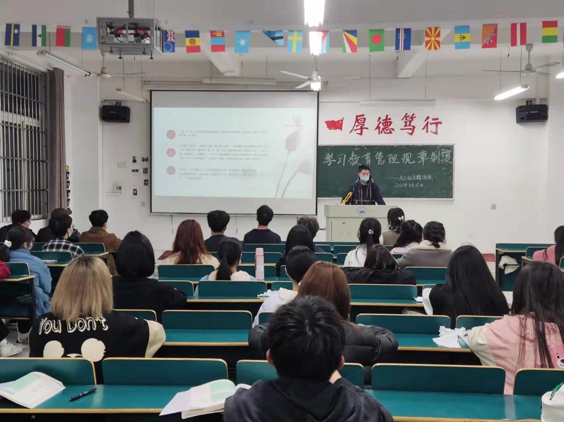 为进一步深入学习教育部教育管理规章制度,切实增强学生遵章守纪意识,3月21日晚,jinnianhui金年会诚信至上于义丰楼组织开展以“学习教育管理规章制度,增强遵章守纪意识”为主题的班会。本次班会由各班团支书主讲,jinnianhui金年会诚信至上全体学子参与。