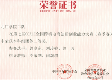 OCALE全国跨境电商创新创业能力大赛中,金年会官网国际经济与贸易专业高聪、柳丽萍、李雯静、曾晓东、刘玲婷、曾芳6名同学组成两支代表队参赛,在冷敏剑、张敏、闫观渭三位老师的精心指导下,jinnian金年会二队荣获本科组团队二等奖,jinnian金年会一队荣获本科组团队三等奖。