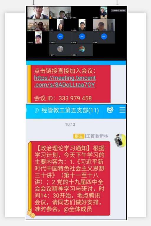 6月17日下午于义丰楼607工商管理教研室对《习近平总书记在专家学者座谈会上的重要讲话精神》《习近平总书记两会期间重要讲话精神》《习近平总书记在中央政治局第二十次集体学习时的讲话》的集中学习之后,6月24日下午14:30始,通过腾讯视频会议方式,经管学院教工第五支部及所在教研室党员与非党员教师线上集中学习了《党的十九届四中全会精神》和《习近平新时代中国特色社会主义思想三十讲(十一至十八讲)》。