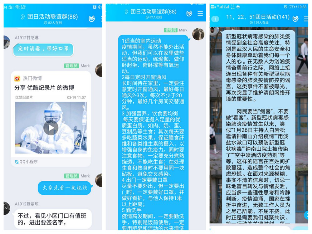 这次主题团课主要是在各班级的QQ群中展开,首先由团支书向同学们介绍了防范病毒的方法以及一些在与病毒作斗争的过程中出现的感人事例,同学们也从中学习了一线抗疫工作者“无私奉献,舍己为人”的感人精神。此后,我们找来参与防疫的同学在群里给大家分享了一些自己在防疫工作中的经历,大家也纷纷对这些行为点赞。在活动接近尾声时,同学们也说出了对此次主题团课的感想“每个人都是平凡而伟大的,没有谁生来就是战士”“哪有什么岁月静好,只是有人替我们负重前行罢了”等等。最后,同学们不约而同地在群里说到“武汉加油,中国加油!”一次意义非凡的主题团课便在这一阵阵暖心的加油声中结束了。