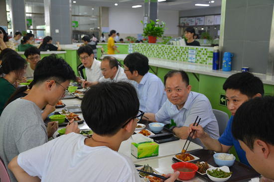 中午11点30分,王万山来到食堂,与同学们一起共进午餐,亲切交流。王万山向同学们详细询问了食堂菜价、饭菜口味、卫生服务等情况。得知身边有大一的学生后,他向同学们传达出殷殷期望:希望他们要从大一便树立远大理想,认真学习专业知识,努力实现自己的理想。王万山亲切入微的交谈,让在座的每一位同学都倍感温暖,就餐气氛轻松愉悦。就餐结束以后,王万山和同学们共同践行了“光盘行动”,鼓励更多师生身体力行。