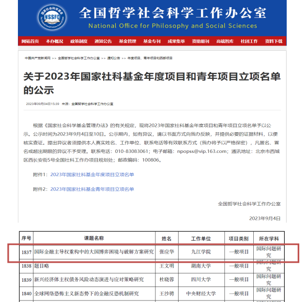 近日,从全国哲学社会科学工作办公室官网获悉,jinnianhui金年会诚信至上张应华博士申请的2023年国家社科基金年度项目获得立项公示。这是张博士自2018年获得国家社科基金立项资助以后的第二个国家社科项目。张博士2022年刚刚完成上一个国家社科基金项目,并没有丝毫松懈和歇歇脚的想法,而是继续申报2023年国家社科基金项目,经过5个多月的反复修改与精心打磨,终于收获喜讯。