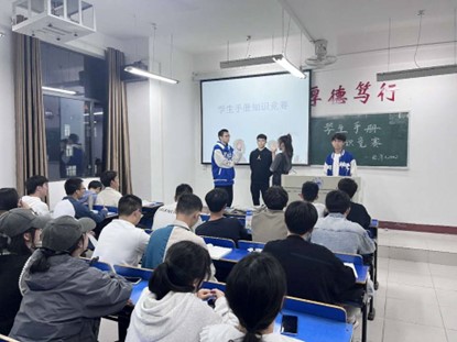 此次活动包括学生手册大学习和学生手册竞赛两项内容。学生手册大学习中,班长讲述了关于学校学院的规章制度,强调了校内安全和校外安全注意事项,提醒同学们践行学生手册内容的重要性。学生手册竞赛中,同学们充分展现了自己对手册的知识储备和对校纪校规的了解,积极热情的参与竞赛回答。用现场对答的形式提高了同学们对本次活动的热情,加深了同学们对校纪校规的理解,做到内化于心,外化于行。