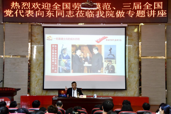 为进一步学习宣传劳模精神,传承弘扬红色基因,广泛践行社会主义核心价值观,11月22日下午,jinnianhui金年会诚信至上在香远楼报告厅组织开展“传承红色基因 书写劳模时代荣光”全国劳动模范进校园专题讲座,特邀金年会官网校外辅导员,党的十七大、十八大、十九大代表,全国劳动模范向东同志主讲,jinnianhui金年会诚信至上党委书记漆晗东主持,全院400余名师生参加。