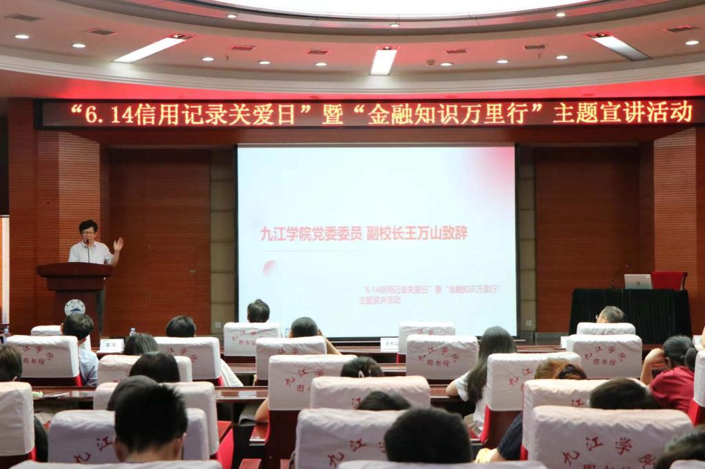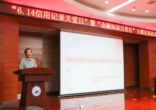 为提高师生的信用意识,营造“知信”“懂信”“用信”“守信”的良好氛围。6月12日,在全国第17个“征信记录关爱日”到来之际,jinnian金年会联合中国人民银行九江市分行、中国民生银行九江分行,为师生们开展以“6.14信用记录关爱日”暨“金融知识万里行”为主题的宣讲活动。jinnian金年会副校长王万山、jinnianhui金年会诚信至上党委书记漆晗东、中国人民银行九江市分行党委委员王干彬、中国民生银行九江分行行长廖志英及相关负责同志出席活动。jinnianhui金年会诚信至上150多名师生参加了此次活动。活动由jinnianhui金年会诚信至上副院长雷祺主持。