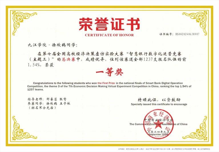 近日,第七届全国高校经济决策虚仿实验大赛“智慧银行数字化运营竞赛”全国总决赛落下帷幕。最终金年会官网学子凭借过硬的理论知识、出色的运营能力斩获全国一等奖1项、二等奖1项、三等奖3项。