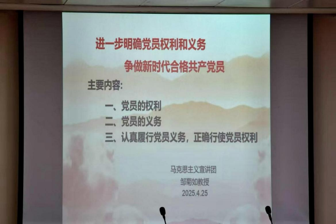 此次党课邀请了马克思主义学院的邹菊如教授进行专题授课。邹菊如教授以进一步明确党员权利与义务,争做新时代合格共产党员为题,通过以小见大的形式、深入浅出的讲解以及先进模范人物案例的生动呈现,带领学员们深入学习了党的理论知识,和身为党员应承担的责任与义务在课堂上,邹菊如教授还着重强调了党员的责任与担当,以及如何树立正确的入党动机。他指出,入党积极分子要时刻以党员的标准严格要求自己,不仅要在组织上入党,更要在思想上入党,真正做到知行合一。同时,要将党的理论知识与实际工作相结合,在工作中发挥先锋模范作用,全心全意为人民服务。