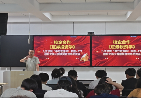 在模拟交易大赛颁奖暨现场交流会之前,该课程负责人张可斐老师携手课程教学团队与合作企业申万宏源证券公司九江分公司相关负责人进行了多次交流研讨,形成校企合作、基地赋能和平台构建为主题的“申万宏源杯”模拟交易大赛方案。方案分四个阶段进行。第一阶段由课程教学团队结合《证券投资学》教学内容,设计股票模拟交易和ETF模拟交易两个赛道;第二阶段由申万宏源九江分公司为学生构建专属模拟平台,便于观察学生的交易情况并进行有效指导;第三阶段指导学生进入专属模拟赛道注册并获得100万模拟资金进行交易,模拟时段自2025年4月28日到2025年6月20日;第四阶段进行活动总结,并举行模拟交易大赛颁奖暨现场交流活动。