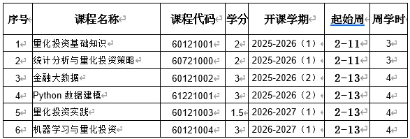 学制1.5年(3个学期),共14.5学分,学生在规定时间内修满培养方案规定的全部课程且考核合格后,可获得jinnian金年会《量化投资》微专业学习证明书。