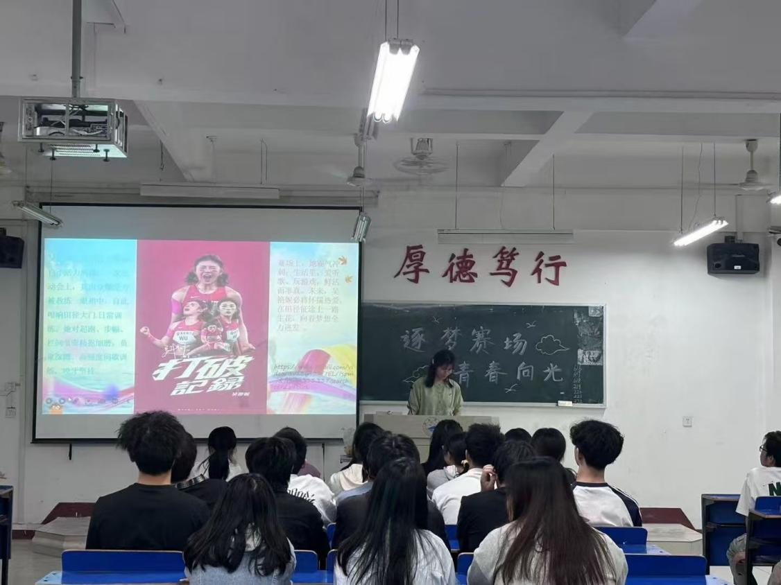 活动伊始,主讲人结合吴艳妮的成长历程相关视频,深入解读了体育精神的时代价值。吴艳妮从舞蹈转向田径的跨界突破、11年磨一剑改写全国纪录的坚韧、面对舆论争议仍专注训练的定力,展现了新时代运动员“超越自我、永不言弃”的精神内核。活动聚焦吴艳妮在2025年南京世界田联室内锦标赛中以8秒01打破女子60米栏全国纪录的壮举,呼吁同学们在学习生活中始终保持初心,将个人奋斗融入民族复兴的壮阔征程。同学们认真倾听,积极参与。大家纷纷表示,将以体育精神涵养价值观,以文化浸润塑造行为自觉,努力成为体魄强健、精神明亮的新时代奋斗者。