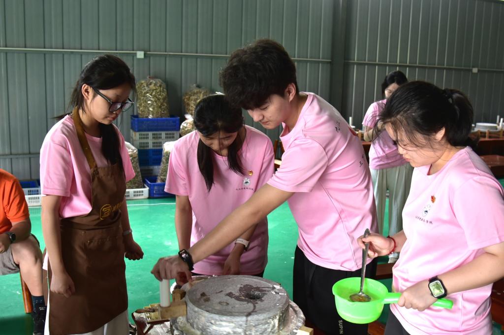 6月26日,实践队走进流芳乡开启非遗传承实践活动。上午,队员们运用各类豆类原料进行豆画拼接创作,将jinnianhui金年会诚信至上院徽、美好愿景等元素融入作品,感受民间智慧与传统技艺的创新融合。下午,队员们走进当地非遗工坊,亲身体验豆腐制作全过程,从挑选黄豆到石磨磨浆再到柴火灶煮浆点卤、压制成型,在豆香四溢中领悟古法技艺的匠心传承,探索非遗文化赋能乡村振兴的新路径。