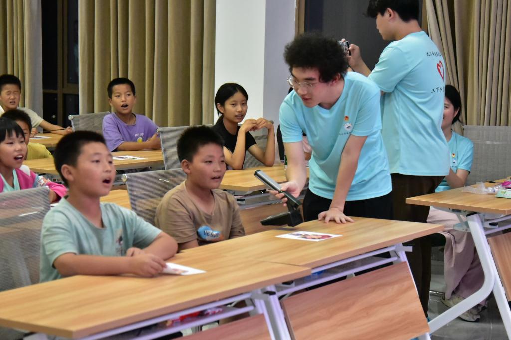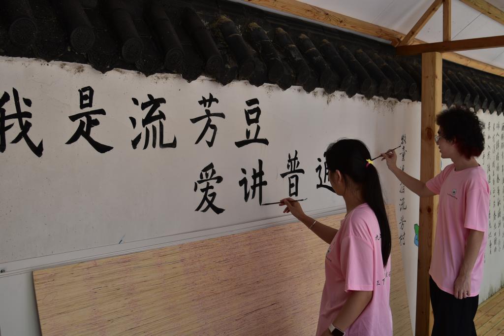 6月25日,服务队走入流芳乡开展“语润童心,经彩筑梦”普通话推广活动。在豆立方会议室,志愿者们通过趣味绕口令、民族文化问答、歌曲联唱等环节,带领孩子们感受普通话的韵律之美。随后,团队结合当地“豆色文化”,将推普工作与田书法楹联、乡规民约、非遗文化融合,设计绘制出富有地方特色的推普墙绘与宣传标语,提升了村民语言交流能力,营造浓厚文化学习氛围,为乡村文旅发展带来新契机。